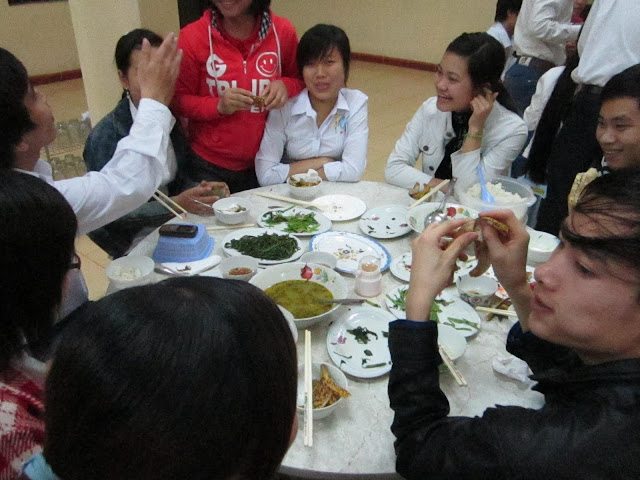 Đến 10h50, chúng tôi được gặp Cha Bề Trên Đan Viện tại phòng khách, Ngài đã xin lỗi chúng tôi vì Ngài không thể gặp chúng tôi khi chúng tôi mới đến, Ngài bảo “lúc đó Cha còn đang bận cùng các Cha, các Thầy tham gia lao động và quần áo của Cha rất lấm lem sợ các Sinh Viên cười nên không dám đến gặp”. Ngài đã giới thiệu cho chúng tôi về lịch sử của nhà Dòng, về công việc hàng ngày của các Cha, các Thầy ở đây. Chúng tôi đã được Ngài dẫn đi tham dự giờ Kinh trưa cùng nhà Dòng vào 11h15, sau giờ kinh chúng tôi đã được gặp mặt Đức Tông Giuse Ngô Quang Kiệt và được dùng bữa với Ngài tại phòng ăn của Đan Viện. Đức Tổng đã chia sẻ với chúng tôi rất nhiều về những thao thức của Ngài, Ngài luôn cầu nguyện cho mỗi người, mỗi con chiên của Ngài được bình an, khỏe mạnh và luôn sống trong ân Nghĩa của Chúa.