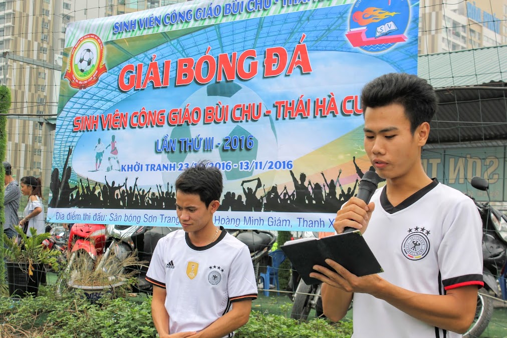 Đúng 8h30 sáng Chúa Nhật ngày 23/10/2016, tại sân bóng Sơn Trang 2, số 1 Hoàng Minh Giám đã diễn ra lễ khai mạc Giải bóng đá SVCG Bùi Chu – Thái Hà lần thứ 3 – năm 2016 với sự hiện diện của 6 đội bóng, các anh chị cựu, các em tân sinh viên cùng đông đảo anh chị em SVCG nhóm Bùi Chu – Thái Hà.