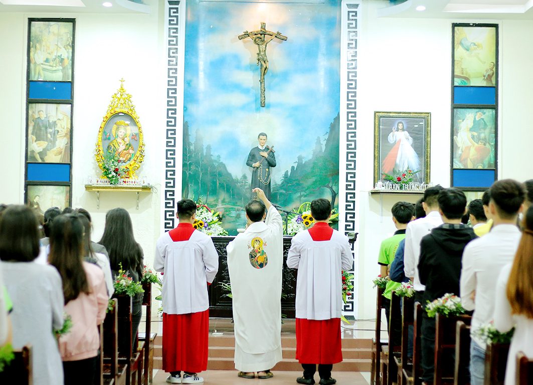18h chiều cùng ngày là khoảng thời gian ghi danh và đón tiếp; quý cộng đoàn và anh chị em đã có mặt rất đông đủ cùng gặp gỡ, ghi danh và tập hát chuẩn bị cho Thánh lễ long trọng sắp diễn ra. Mọi người cùng quy tụ nhau nơi đây, dưới sự soi sáng của Thánh quan thầy Teresa với niềm tin yêu dâng lên Thiên Chúa những lời cảm tạ với biết bao tình thương mà Ngài đã dành cho nhóm SVCG Bùi Chu-Thái Hà. Những tâm tình ấy đã khiến cho Thánh lễ lúc 18h45 diễn ra trong bầu không khí trang trọng, sốt sắng và mang nhiều cung bậc cảm xúc trong tâm hồn mỗi người. Thánh lễ do cha Gioan Lưu Ngọc Quỳnh Csr, DCCT Hà Nội chủ tế diễn ra thật sốt sắng và đặc biệt vì mang nhiều ý nghĩa: Tạ ơn Hồng ân Thiên Chúa qua lời cầu bầu của Thánh Teresa Hài Nhi – Quan thầy nhóm; mừng 13 năm gây dựng và phát triển; gặp gỡ tri ân Quý Đấng bậc – Thân nhân – Ân nhân và các anh chị cựu đã không mệt mỏi hi sinh, gây dựng, cộng tác và giúp đỡ nhóm trong suốt những năm qua.