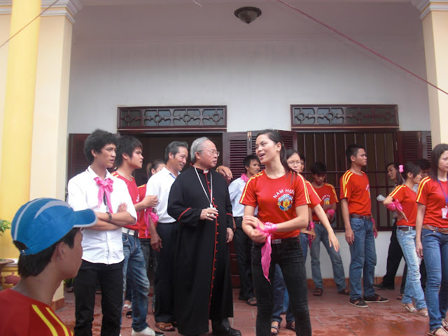 Lễ truyền thống năm nào cũng vậy, cứ mỗi sau thánh lễ, từng đoàn, từng nhóm, từng cá nhân lại tranh nhau chụp ảnh lưu niệm với đức cha, vẫn biết chân ngài đau đấy nhưng biết sao được khi nhận thấy đức cha cũng đang rất cố gắng để cho chúng tôi những bức ảnh đẹp, những kỷ niệm sâu sắc….Rồi sau đó ngài thường ăn rất nhanh để dành chút thời gian còn lại để hỏi han, để vui đùa cùng các “cháu”. Nhìn những hình ảnh đó tôi lại liên tưởng đến Gioan Bosco mặc áo trùng thâm vui đùa cùng các thanh thiếu nhi trong giáo xứ. Đức cha là cha dòng Salêdiêng Donbosco (SDB), ngài đã học gương thánh tổ của dòng mình, mặc dù tuổi già, chân đi tập tễnh bước thấp bước cao (đức cha bị bệnh đau chân) nhưng ngài luôn trẻ với chúng con, ngài hòa mình với sinh viên, ngài tan chảy trong sinh viên và ngài cũng đã vui, đã cười hết mình với chúng con. Chúng con cũng hay biểu diễn các bài cử điệu vui nhộn, những tiết mục đặc sắc để tặng đức cha và mỗi lần như thế, chúng con lại được chiêm ngưỡng những nụ cười thật tươi, thật sáng khoái của đức cha. Đến lúc chia tay ra về thật sự chẳng ai muốn rời xa đức cha cả!