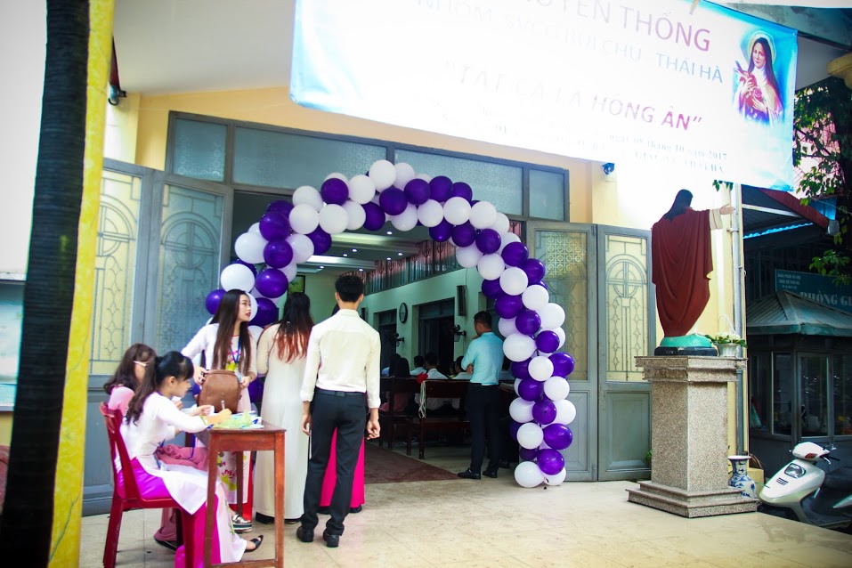 Ngay 6h30 sáng, Ban Lễ Tân đã sẵn sàng để chào đón các vị khách quý. Lúc này ngay trong khuân viên của đền thánh đã thấy được những tiếng cười nói, những câu chuyện mà mọi người muốn chia sẻ cho nhau, những cái bắt tay, cái ôm của anh chị em lâu ngày không thể gặp nhau, nơi đây vẫn nồng ấm và chan chứa tình yêu như thế, một tình yêu thương , đoàn kết và phục vụ đã liên kết gắn chặt anh chị em lại bên nhau. Phải! Chính Thánh nữ Terasa Hài Đồng Giê-Su, quan thầy nhóm SVCG Bùi Chu – Thái Hà đang dẫn dắt những con người ấy hy sinh lặng thầm cho một tình yêu lớn lao.