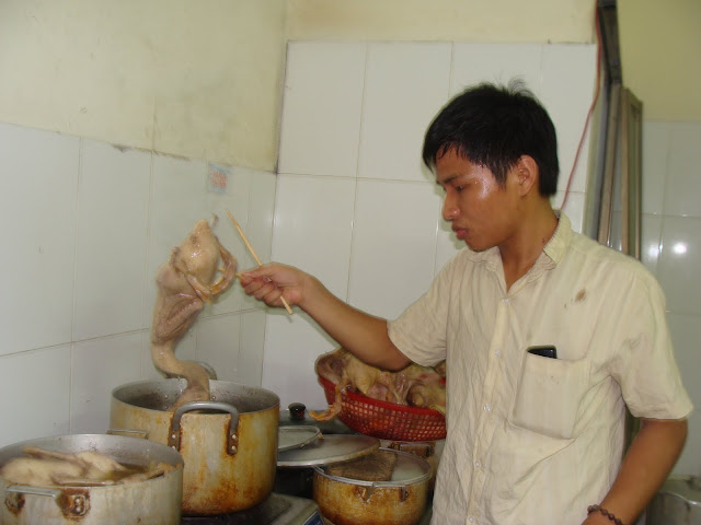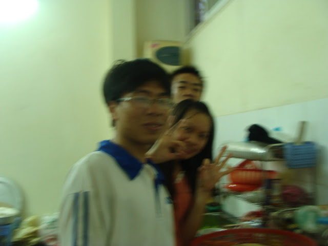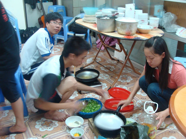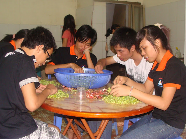 Bạn Minh: do 2 ngày các em phải đi thi sớm và số lượng các em cũng đông, để đảm bảo thời gian cho hơn 60 em, chúng em dậy từ 2h30 sáng để nhóm bếp và chuẩn bị. Sau đó thì em và chị Nụ đi chợ…., hi, bọn em lên chợ đầu mối mua đồ vừa nhiều, vừa ngon, vừa rẻ…. à mấy anh chị chở các bạn đến trường rồi cũng xông pha vào bếp cùng chúng em nữa. 11h ăn trưa và 6h30 ăn tối là thời gian cố định cho các em ăn, để các em còn nghỉ nghơi nữa mà….sau bữa ăn, bọn em dọn dẹp và lại ngồi lại lên thực đơn hôm sau…và kiểm kê tài sản( cười).