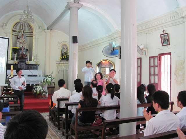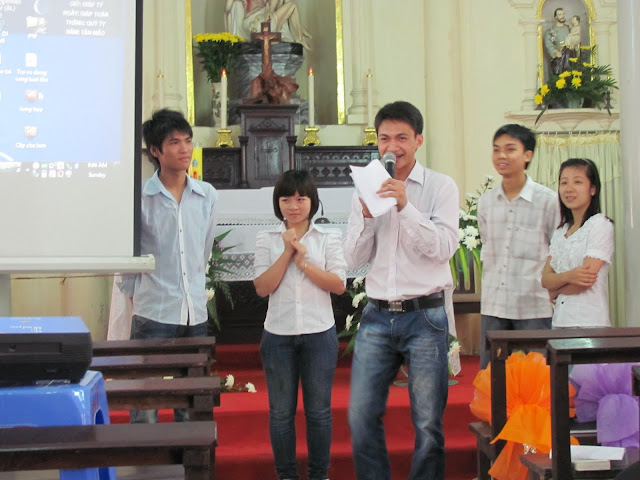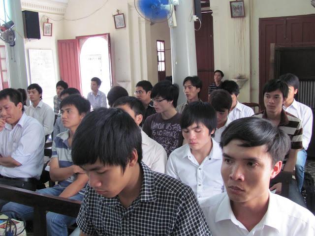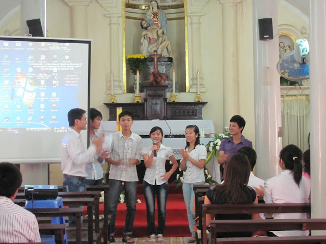 Buổi chia sẻ trở nên nóng bỏng hơn với chủ đề :“ Hôn nhân với người ngoài Công Giáo”. Sau khi xem video tình huống do chính các bạn sinh viên Trung Lao viết kịch bản và dàn dựng. Như có sự thôi thúc của con tim và bắt đúng tâm trạng, các bạn trẻ, anh chị cựu, đặc biệt cả quý Thầy đều rất hào hứng đưa ra những quan điểm, suy nghĩ, cách giải quyết những khó khăn từ phía gia đình, cuộc sống sau này nếu kết hôn với một người khác Tôn Giáo, dường như khoảng thời gian gần 1 tiếng là quá ngắn để chia sẻ chủ đề này. Và rồi tất cả như hiểu thêm, yên tâm hơn khi được Cha Giuse trấn an, đưa ra lời khuyên của một Linh Mục: “mỗi chúng ta là một công trình Chúa muốn xây dựng, các bạn hãy đến với nhau bằng con tim chân thật, cùng nhau ý thức xây dựng hạnh phúc trong niềm tin và tình yêu nơi Chúa Giê-su…”
