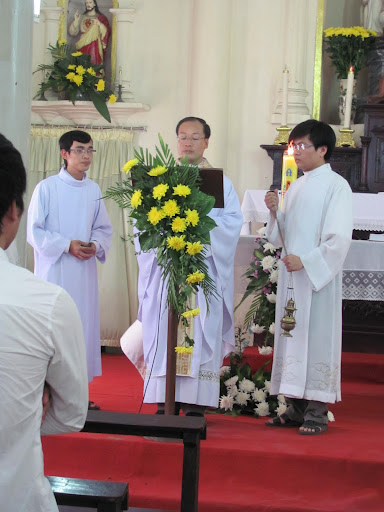 Đúng 10h30’ Thánh Lễ được long trọng cử hành do cha Giu se Vũ Đình Lâm chủ sự . Ngỏ lời với các bạn sinh viên, cha đã nhấn mạnh đến việc thực hành đời sống đạo. Tình yêu không chỉ bằng lời nói mà phải bằng những hành động hi sinh cụ thể cho nhau. Cũng vậy, yêu mến Thiên Chúa không chỉ bằng môi miệng mà phải chứng tỏ tình yêu ấy bằng việc tuân giữ các giới răn của Chúa. Theo cha, quí khách và quí anh chị cựu sinh viên đã hi sinh thời gian quí báu của mình để đến với sinh viên cũng vì tình yêu mến dành cho sinh viên .
