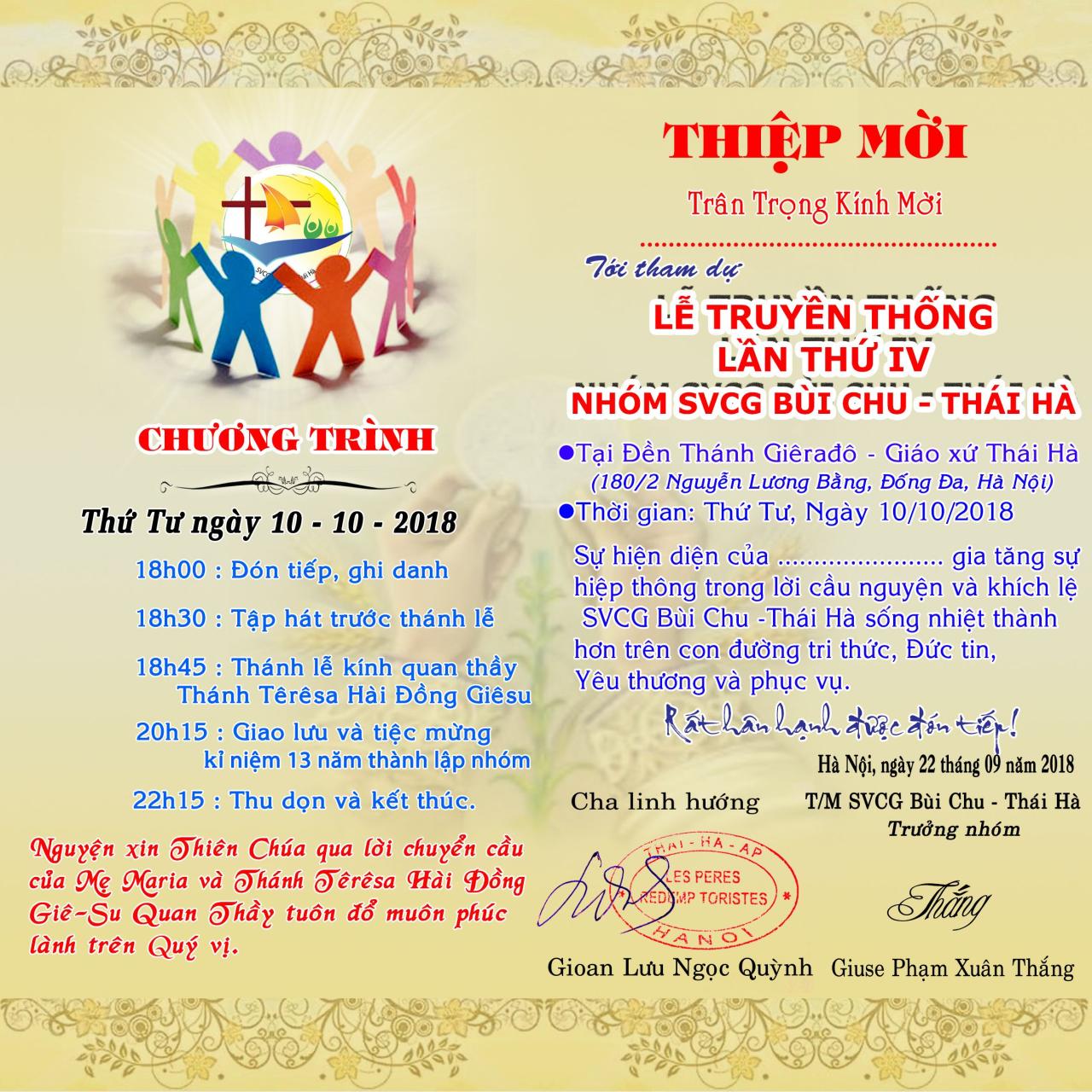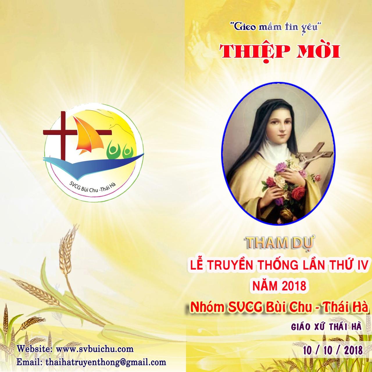 Nhờ hồng ân Thiên Chúa, qua lời chuyển cầu của Thánh Têrêsa Hài Đồng Giêsu, được sự đồng ý của Cha linh hướng, nhóm Sinh viên Công Giáo (SVCG) Bùi Chu – Thái Hà hân hoan tổ chức Lễ Truyền Thống lần thứ IV – năm 2018 nhằm kính Thánh quan thầy Têrêsa và mừng kỷ niệm 13 năm thành lập nhóm (2005 – 2018).