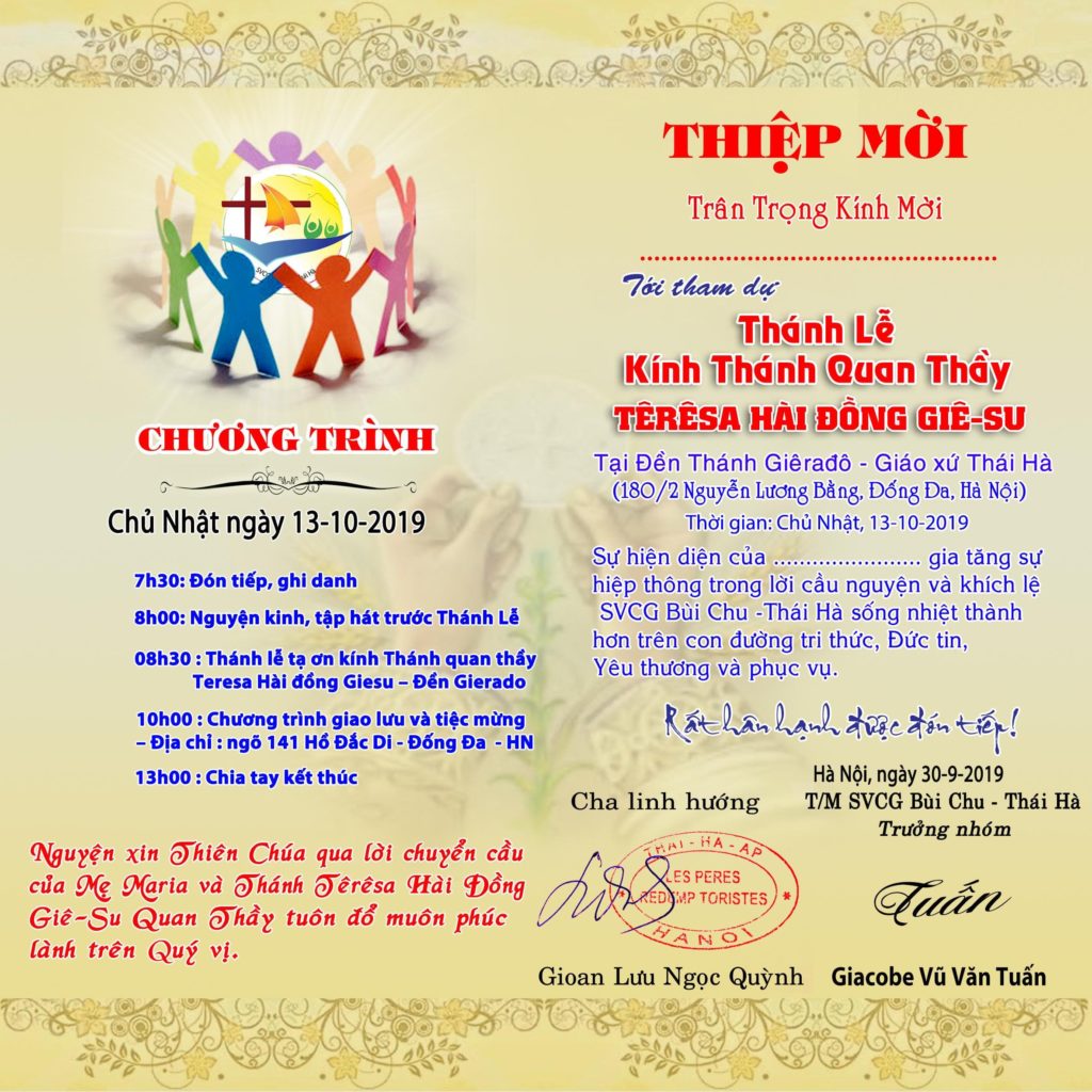 Nhờ hồng ân Thiên Chúa, qua lời chuyển cầu của Thánh Têrêsa Hài Đồng Giêsu, được sự đồng ý của Cha linh hướng, nhóm Sinh viên Công Giáo (SVCG) Bùi Chu – Thái Hà hân hoan tổ chức Lễ Truyền Thống lần thứ V – năm 2019, mừng kính Thánh quan thầy Têrêsa và mừng kỷ niệm 14 năm thành lập nhóm (2005 – 2019). Chúng con trân trọng kính mời: Quý Cha, quý nam nữ tu sĩ, quý vị ân nhân, thân nhân xa gần, quý khách mời; quý anh chị cựu và các bạn sinh viên cùng toàn thể Cộng đoàn dân Chúa Tới tham dự Lễ Truyền Thống nhóm SVCG Bùi Chu – Thái Hà.