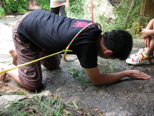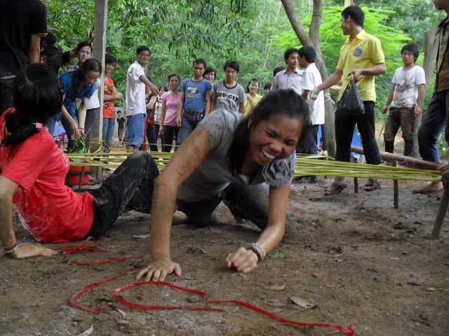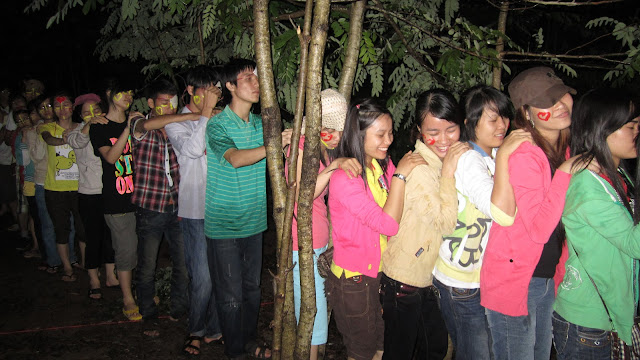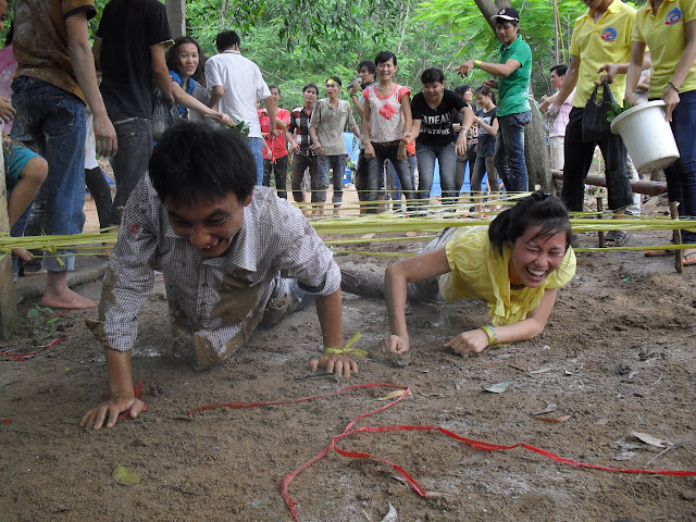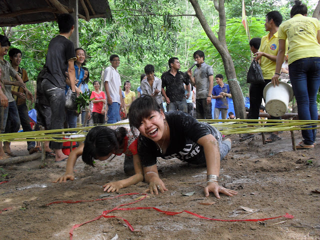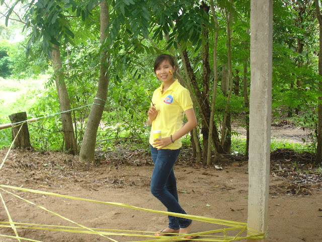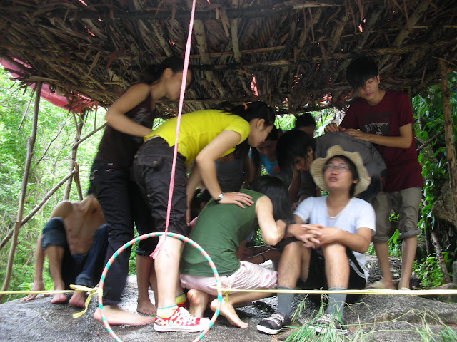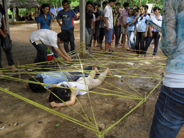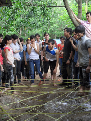 Đây là thử thách mà các bạn phải vượt qua, làm sao các bạn bò qua đây mà không đụng vào giây, thì các bạn mới được tham gia Hội trại.