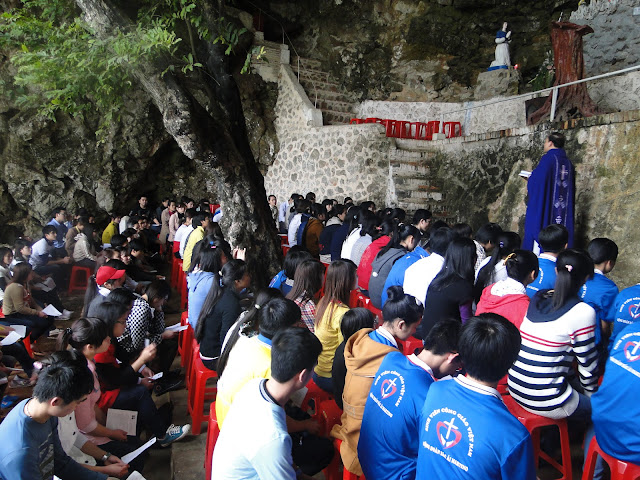Kết thúc 14 nơi Thương Khó, cũng là lúc chúng tôi cùng nhau bước vào Thánh Lễ tại một chiếc hang nằm trên núi. Thánh lễ là cao điểm của cuộc hành trình về với Chúa ngày hôm nay. “Các bạn sinh viên đã cùng nhau vượt qua 14 nơi Thương Khó của Chúa, các bạn hãy cùng nhau nhìn lại bản thân mình, cuộc sống sinh viên đầy rẫy những thử thách và cạm bẫy mà các bạn gặp phải. Ngày hôm nay hãy coi đó như những cây Thập Tự mà Chúa gửi đến nơi cuộc đời các bạn. Nếu các bạn biết vác Thập giá Chúa mỗi ngày, và các bạn chiến thắng được những thử thách mà Chúa gửi đến thì chắc chắn Chúa sẽ thưởng công cho những gì mà các bạn đã làm với Ngài” Đó là lời nhắn nhủ mà Cha Simon Hòa chủ tế đã gửi đến chúng tôi trong bài chia sẻ Tin Mừng.