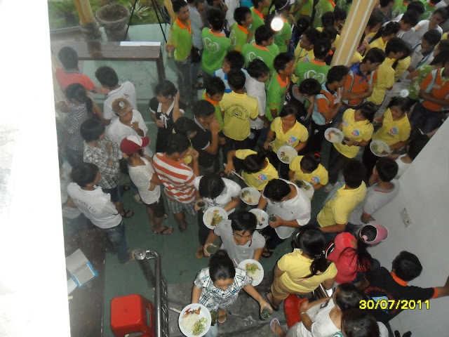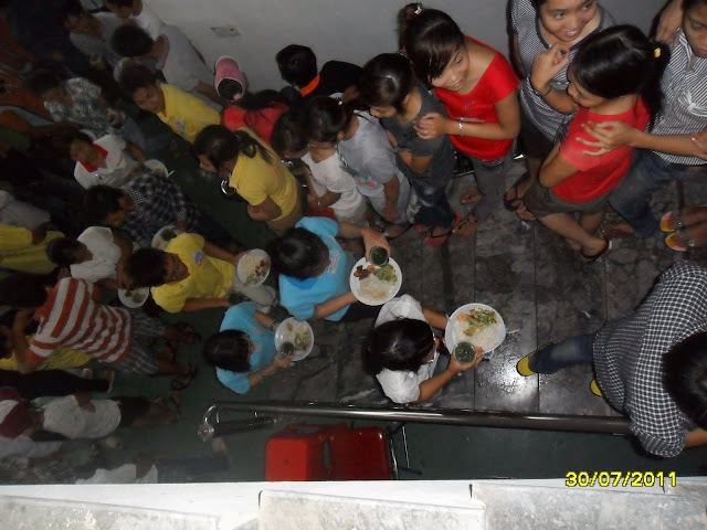 Hiện tại là 18h, đã đến giờ cơm tối, các bạn sinh viên của chúng ta đang “xếp hàng” lấy khẩu phần ăn cho mình, đông vui phải biết